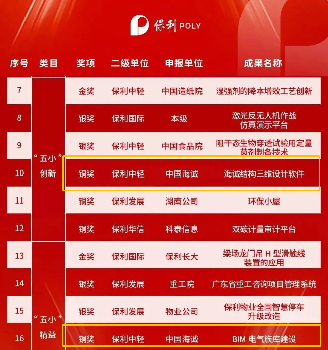 In May this year, Poly Group organized and carried out the "five minor" activity. After seven months of organization and registration, preliminary review and expert review, the "Haisum 3D structural design software" and "BIM electrical library construction" presented by China Haisum stood out from more than 2000 entries, and won the "five minor" bronze medal for innovation and "five minor" bronze medal for lean management respectively.