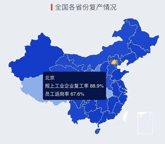 此外,小程序在首頁展示了收集到的各省份以及輕工各行業(yè)整體復(fù)工情況數(shù)據(jù),方便企業(yè)增進(jìn)對(duì)行業(yè)的直觀了解,加深對(duì)行業(yè)的深度認(rèn)識(shí),從而對(duì)企業(yè)自身有更加明晰的判斷。